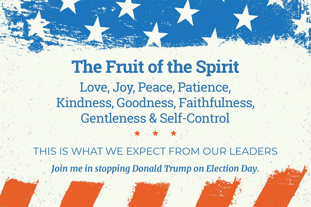 Reach a faith voter in a Swing State by sending them a customized postcard asking them to “Join you in stopping Donald Trump on Election Day.” These Postcards are designed with a message for faith voters, calling them to make faith, hope, and love their voting criteria. The address side has ample room for you to write a personal message.